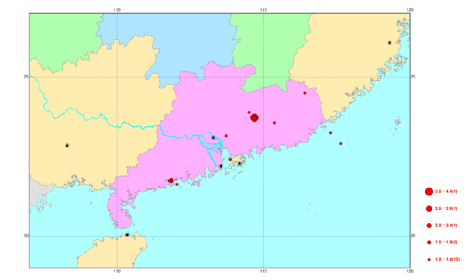 ??? 本月(2025年5月)廣東省及近海共發生1級以上地震18次,最大為5月29日廣東河源(北緯23.72度,東經114.69度)3.5級地震。本月我省地震活動水平較上月有所升高(上月發生1級以上地震17次,最大3.0級)。地震主要分布在河源(5次)、東源(1次)、陽江(5次)、陽西(1次)、南澳海域(1次)、梅州(1次)、增城(1次)、珠海海域(1次)、紫金(1次)、南海(1次)。